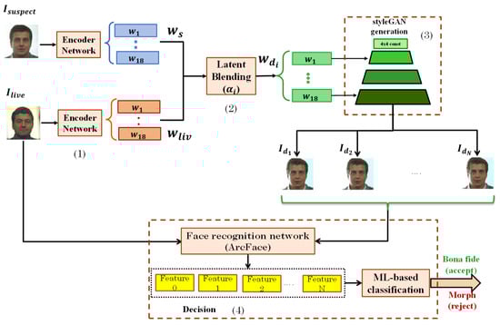 With the primary goal of classifying whether the suspect image is morphed or bona fide, rather than reconstructing the accomplice’s face from the morphed image, we aim to reduce reliance on prior knowledge of face morphing generation in existing de-morphing methods and improve the efficiency of detecting morphing attacks. To achieve this, we train a neural network to recognize the similarity score patterns of de-morphed images, considering different contribution factors associated with enrollment. As we will show in Section 5, similarity score variation of the de-morphed image with the live capture varying the de-morphing factor shows different patterns. Inspired by differences in similarity score variations between morphed and non-morphed images, the detection pipeline was proposed to learn the variation patterns of similarity scores between live capture and de-morphed face images with different de-morphing factors. An effective deep de-morphing network based on StyleGAN and the pSp (pixel2style2pixel) encoder [21] was developed. The network generates de-morphed images from suspect and live images with multiple de-morphing factors and calculates similarity scores between feature vectors from the ArcFace network, which are then classified by the detection network.