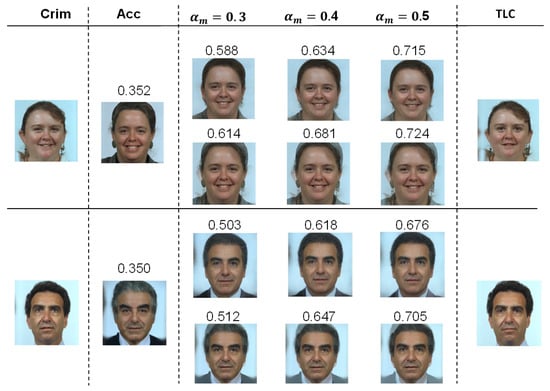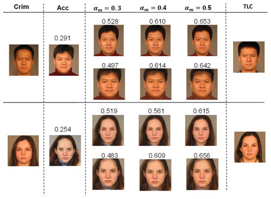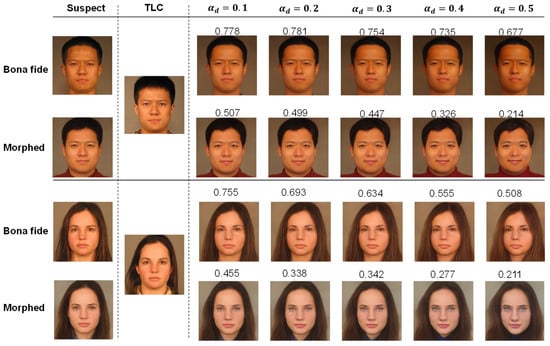 Figure 3 and Figure 4 present some examples of morphed images generated by the proposed StyleGAN-based morphing method and FaceMorpher [3]. The first and second columns show criminals and accomplices, respectively, with the cosine similarity score calculated between them. The third to fifth columns display morphed images with morphing alphas ranging from to . The scores of these morphed images are compared with the TLC images in the last column. It is obvious that as the morphing alpha increases, the morphed images exhibit higher similarity scores when compared with the criminal, indicating a greater correlation to the criminal.