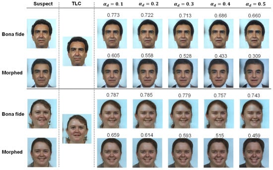 Examples of de-morphing on bona fide and morphed images from FRGCv2. The first and second columns show the suspect (bona fide or morph) and TLC. The third to seventh columns display de-morphed images with alphas from to , and their scores are compared with TLC.