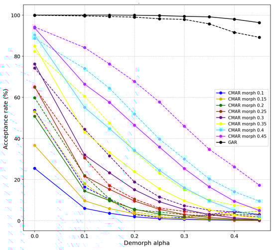 During the morphing and de-morphing experimentation, a threshold score corresponding to a FAR (False Acceptance Rate) of has been used for both datasets according to Frontex guidelines, where the target FAR is and FRR is . Table 3 summarizes the Criminal Morph Acceptance Rate (CMAR) of morphed images in protocol 1. The results (Table 2) indicate that as the criminal’s contribution to the image becomes more noticeable, the acceptance rate of morphed images increases significantly, eventually reaching a level comparable to that of the landmark-based method [3] ( and compared with and ).
