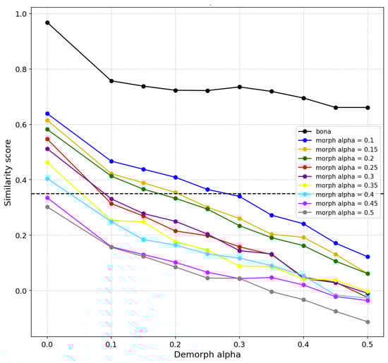 We apply the above de-morphing process with the same and at N de-morphing factor in the range and obtain multiple de-morphed images . A face recognition network (ArcFace [43] in this work) is employed to extract the face-related features with a size of 512 from the TLC, and a set of N de-morphed images for , is TLC’s feature. These features are combined to produce N similarity scores between and . These scores are then fed into a fully connected MLP classifier with three layers: an input layer of size N, a hidden layer with nodes, and a single output node with sigmoid activation. The network is trained using the Adam optimizer with a learning rate of 0.001 for 10 epochs, with a 7:3 training-to-test split.