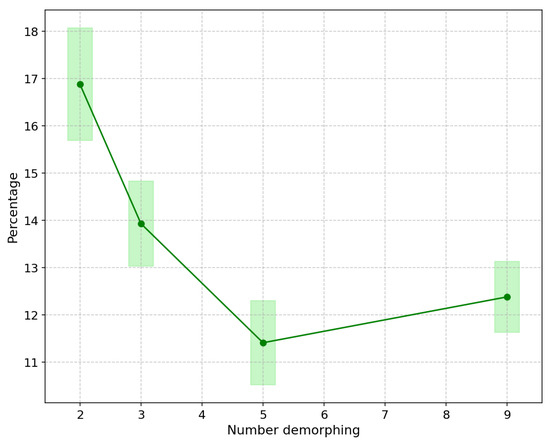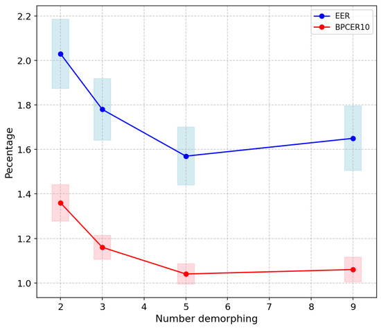ERR and BPCER10 for different numbers of de-morphing. The line plot illustrates the average values, while the rectangles surrounding each data point indicate the range of potential error, with the heights representing the standard deviation at a rate of .