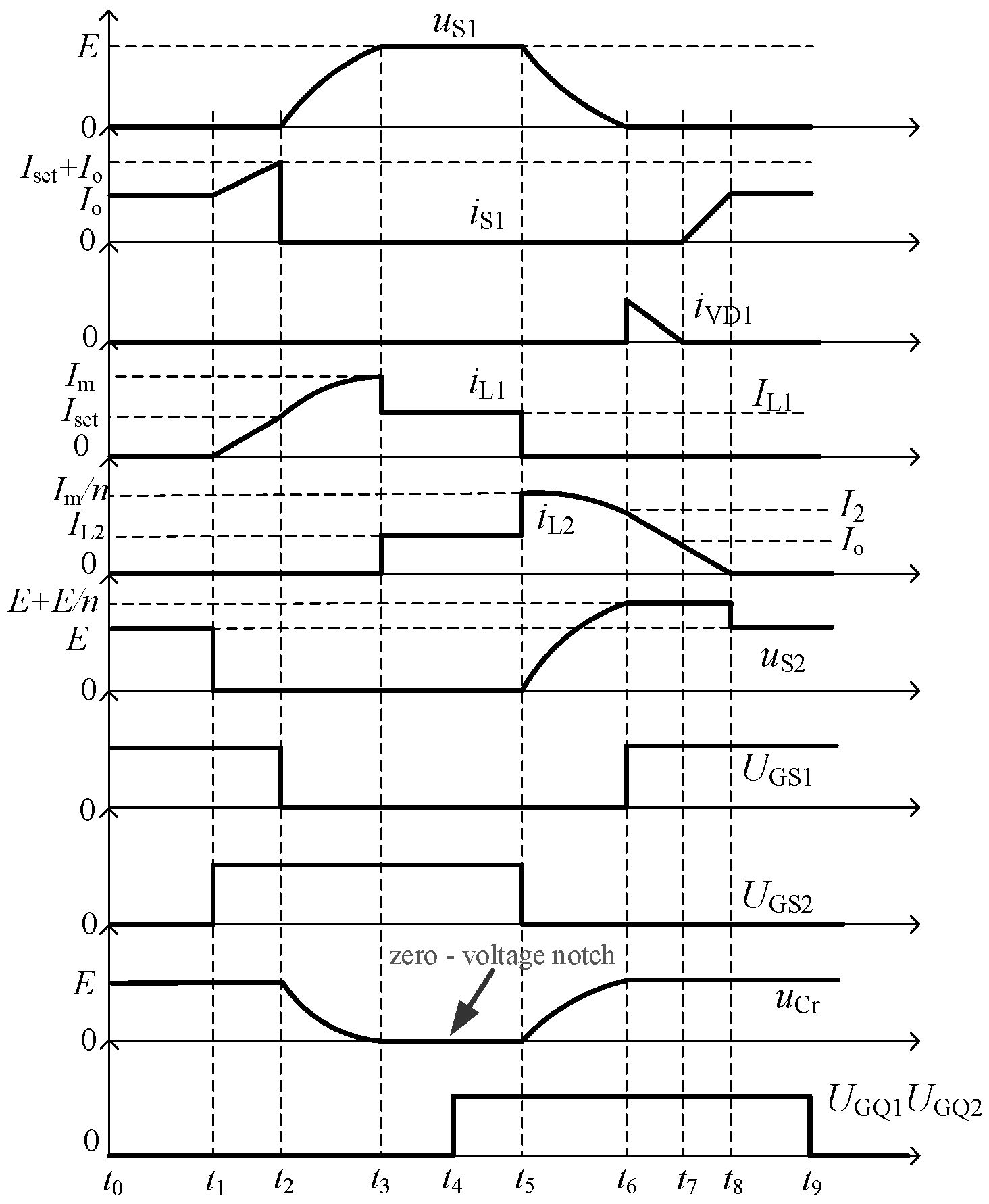 - To ensure that auxiliary switches S1 and S2 achieve zero-voltage turn-off (ZVT) with minimal voltage rise rates at turn-off instants, the selected values of current setpoint Iset, resonant inductor L1, and resonant capacitor Cr must satisfy the condition that the voltage rise rates of S1 and S2 do not exceed permissible limits.