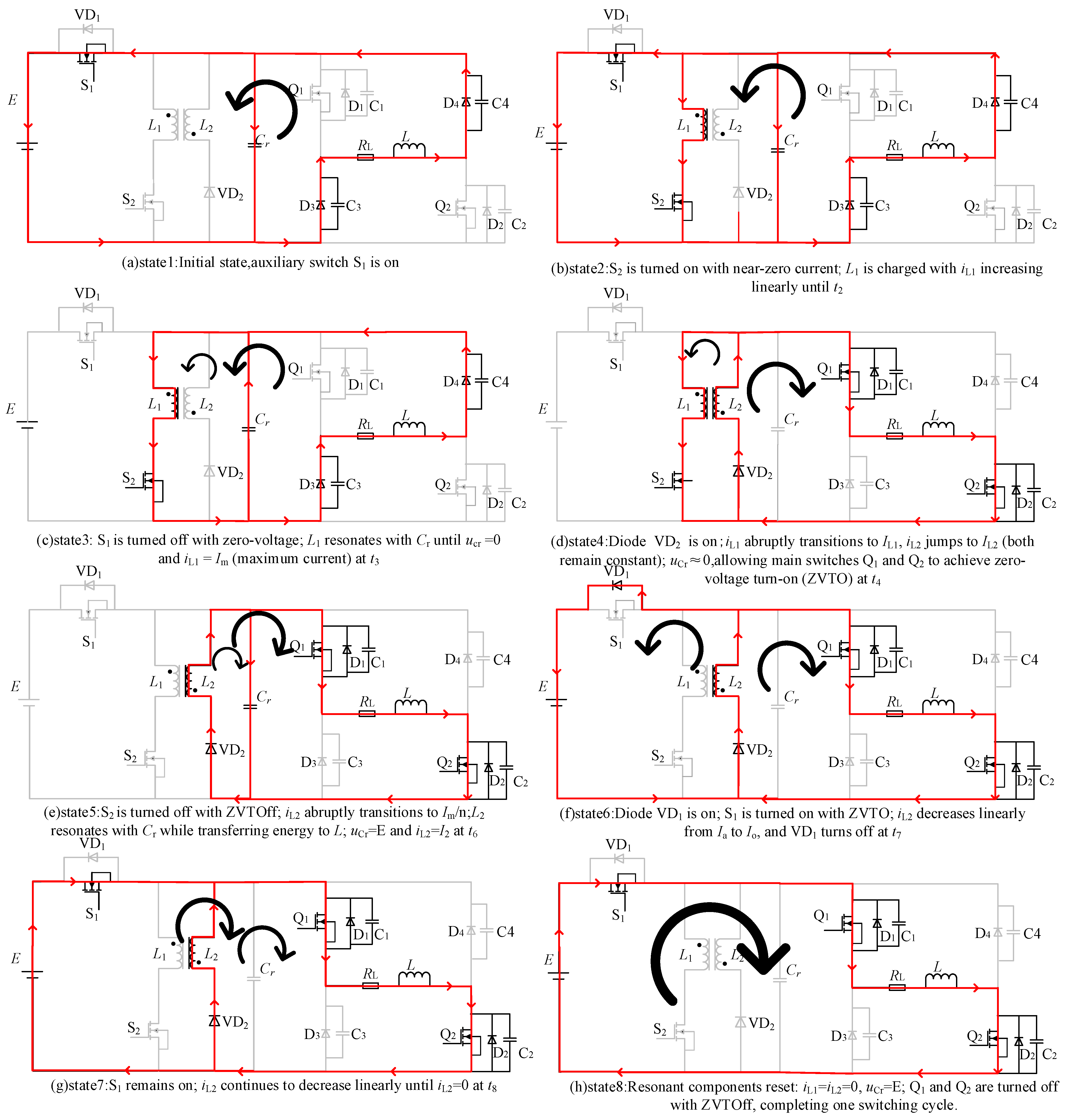 - To achieve zero-voltage turn-on (ZVT) for switch S1, the selected values of current setpoint Iset, resonant inductor L1, resonant capacitor Cr, and turns ratio n of coupled resonant inductors must ensure that the DC bus voltage can recover to the supply voltage during resonance. Based on Equation (8), these four parameters should satisfy the following relationship: