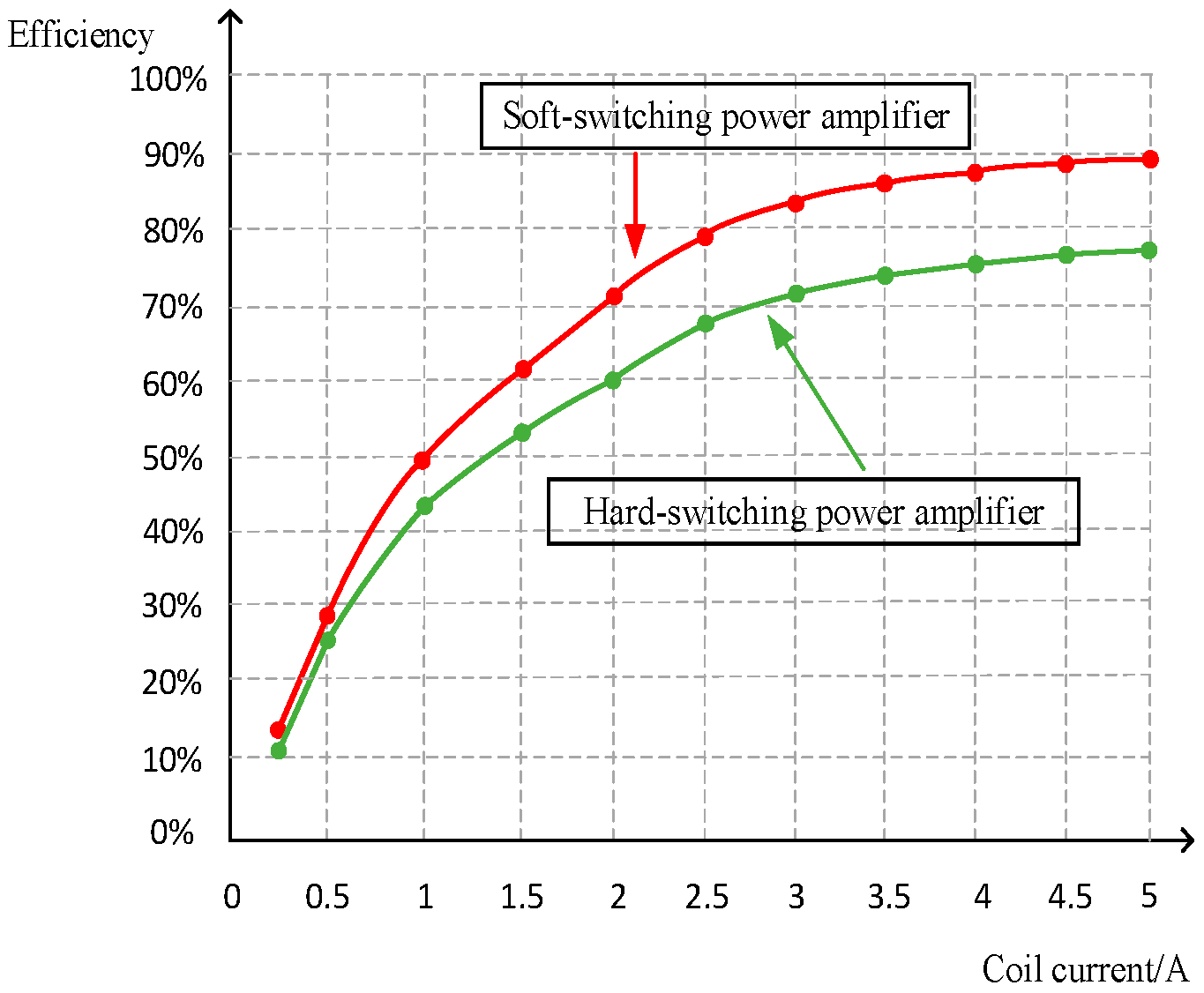 - Compared with the traditional hard-switching power amplifier, the proposed soft-switching power amplifier achieves higher system efficiency. Specifically, with an output current of 3 A, the efficiency of the soft-switching power amplifier can be enhanced by 10%.
