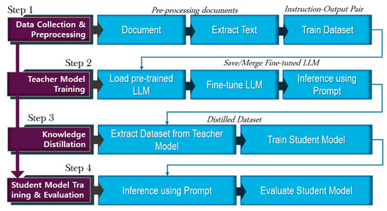 First, School Administration documents are converted to PDF files using HANCOM 2002. Images are excluded, and during text extraction, unnecessary grammatical particles and emphatic expressions are removed through a preprocessing step. Next, knowledge distillation is performed. Knowledge distillation involves a student model learning from a teacher model to increase data accuracy while minimizing parameters [30].