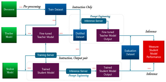 This prompt consists solely of instructions without output and is designed to generate various academic administrative documents. The actual knowledge distillation process consists of extracting the dataset from the teacher model. We query the fine-tuned teacher model step-by-step with the inference prompt to obtain actual outputs, which are then used as the training dataset for the student model. The student model uses a low-parameter model that can run sufficiently even on computers or servers equipped with low-specification GPUs. To achieve the maximum effect with minimal data, allowing even low-specification models to work, we limit the number of documents to 80. The student model is trained using distilled prompts, and its outputs are used to construct instruction–output data pairs. Finally, an evaluation dataset is prepared to analyze the trained student model’s performance. This dataset is acquired through inference results from each model, enabling performance analysis.