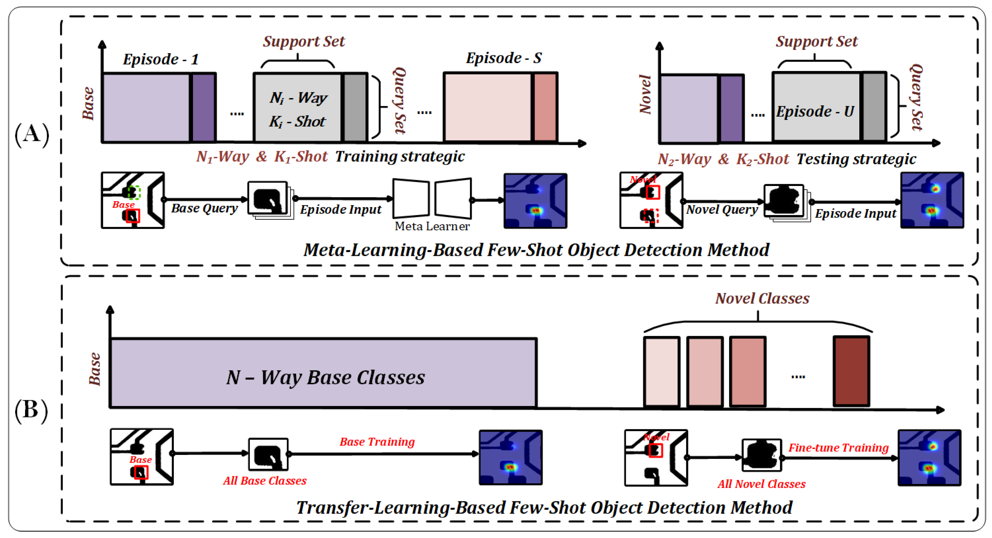However, in the context of practical industrial applications, a significant research gap persists between the current few-shot object detection techniques and PCB defect detection requirements. Conventional few-shot methods prove inadequate in addressing the characteristic challenges of PCB defects—including low contrast, microscopic scales, and complex background noise—while traditional PCB surface inspection methodologies remain heavily dependent on large annotated datasets, fundamentally failing to overcome the scarcity of defect samples in real-world production environments. Existing research has yet to effectively resolve critical challenges such as domain adaptation needs, real-time processing constraints, and sensitivity to microscopic defects in manufacturing settings. Consequently, our research aims to bridge this gap by advancing innovative applications of few-shot learning theory in industrial vision systems, thereby enhancing quality control standards for electronic products.