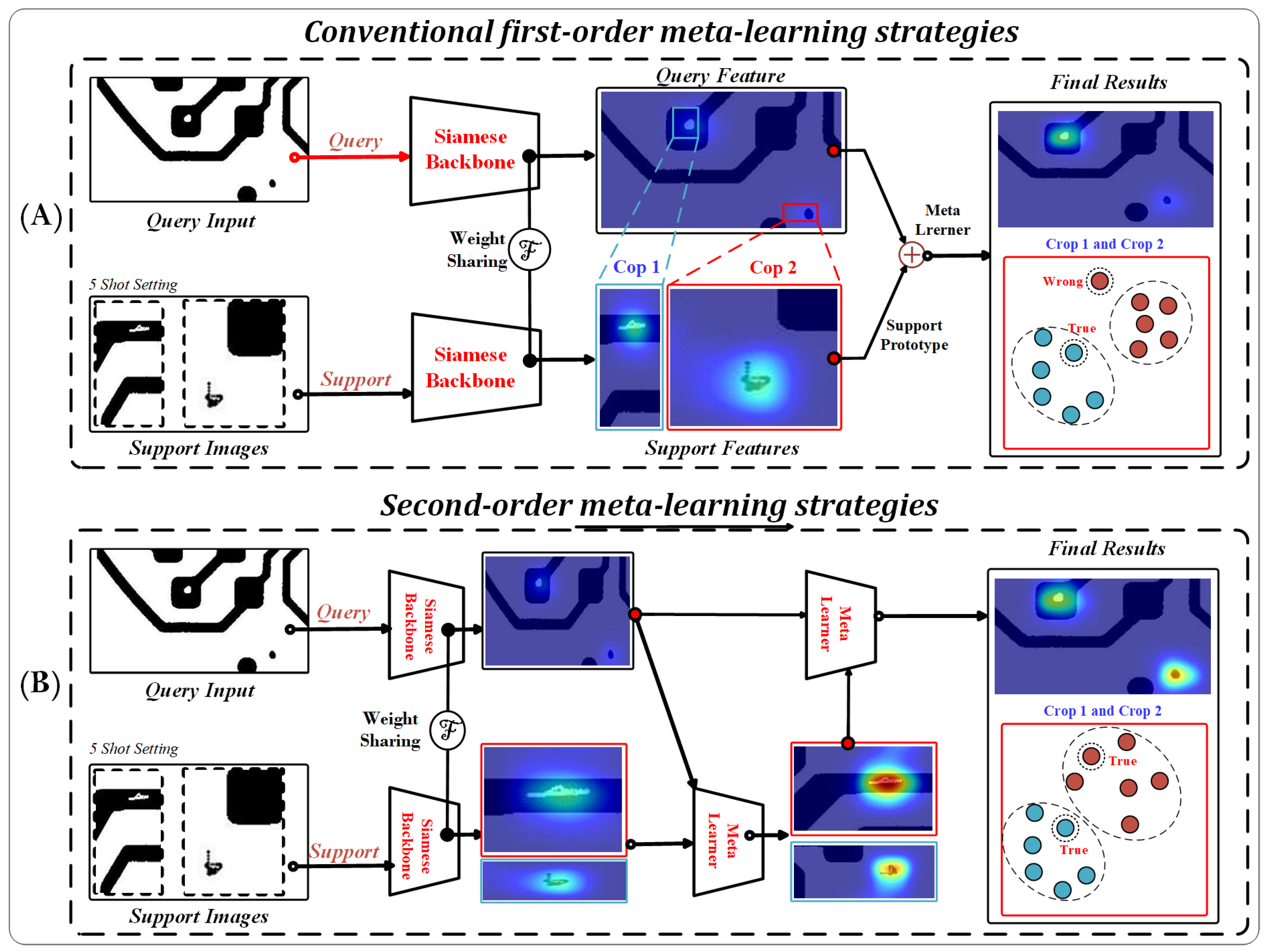 In the first-order meta-learning phase, the features of query samples dynamically modulate the feature distribution of support samples via a meta-learner, generating more representative support prototypes. This process not only integrates the internal structural relationships of the support samples but also incorporates similarity metrics between query and support samples, enabling prototype generation to adaptively focus on the critical features of minority-class defects. In the second-order meta-learning phase, the refined support prototypes guide the deep semantic mining of query samples; another meta-learer aligns the support prototypes with the deep features of query samples at this stage, enhancing the distinction between defects and the background in a higher-dimensional semantic space, thereby significantly improving the recognition capabilities for rare defect samples. Furthermore, the strategy employs data augmentation methods such as cropping and random rotation on input samples to increase the diversity of defect samples.