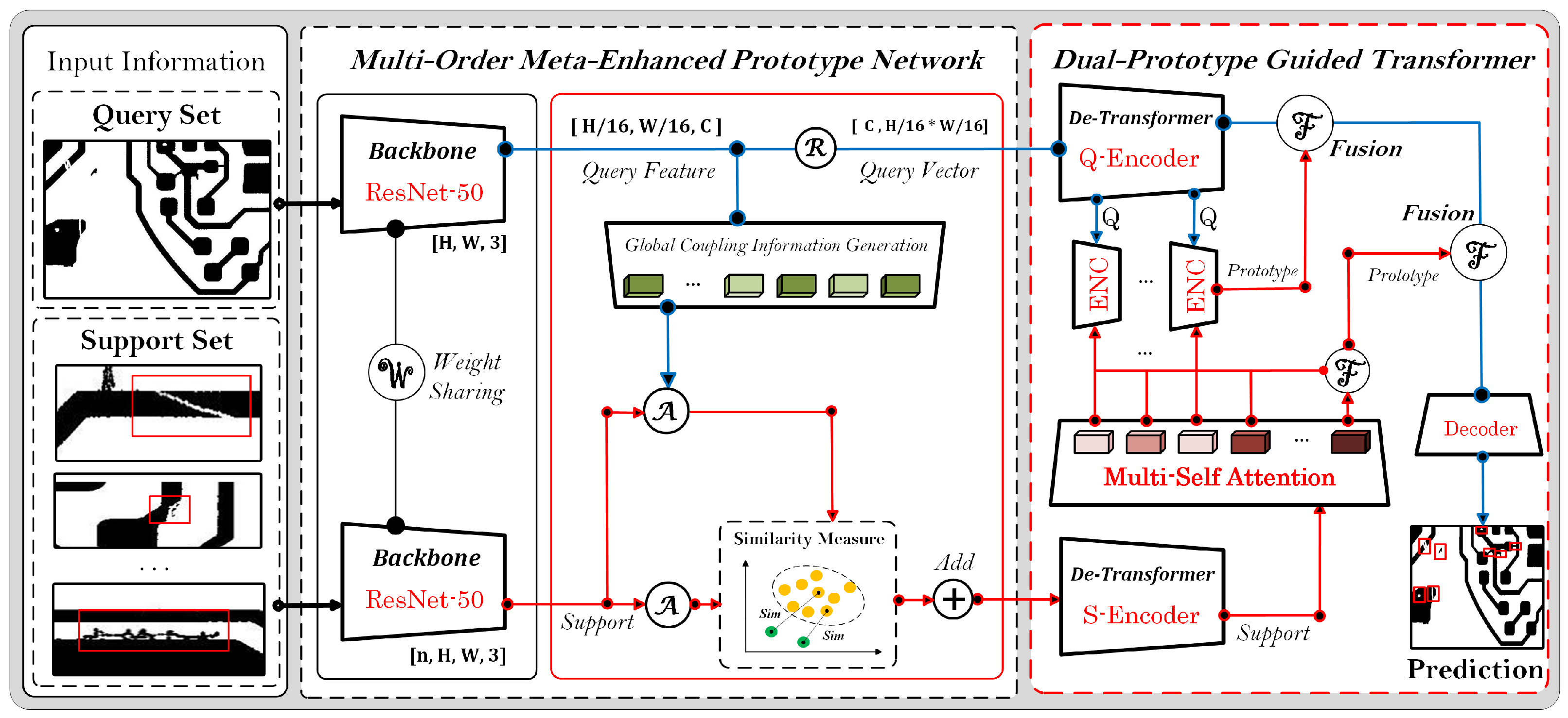 9] proposed a ResNet-SE-CBAM Siamese network that integrates residual modules, squeeze-and-excitation modules, and convolutional block attention modules. This architecture enhances feature extraction capabilities through attention mechanisms and employs metric learning to enable category expansion without retraining. Combined with SSIM-based sample selection and high-defect-rate training strategies, their method focuses on optimizing feature representation through attention mechanisms, thereby complementing the multi-scale defect-aware prototype network proposed in the following section. We propose a second-order meta-learning-based few-shot object detection algorithm for PCB surface defect inspection, which achieves query–support feature fusion and cross-domain knowledge transfer through a dual-path Transformer architecture. Specifically, the current meta-learning approaches predominantly adopt the Faster R-CNN framework, whose detection performance heavily relies on the accuracy of region proposal generation. However, region proposals tend to overemphasize local texture features, making it difficult for the model to learn comprehensive foreground representations of PCB surface defects when novel classes are few and intra-class variations are limited. Therefore, this paper introduces a deformable Transformer structure as the fundamental framework for object detection, thereby mitigating the issues of excessive local feature dependency and error propagation in target localization that are inherent to region proposal-based approaches. Extending this approach, to address the challenge of insufficient intra-class sample diversity for novel categories in few-shot PCB defect detection tasks, we propose a multi-order meta-enhanced prototype (MOMP) Network. This framework employs meta-learning strategies for shallow feature enhancement, dynamically optimizing support features using globally filtered query features. The method effectively resolves the limitation of conventional single-feature-constructed support prototypes in comprehensively capturing target diversity and complexity, which often restricts their guidance capabilities for query information. Furthermore, to tackle the few-shot defect foreground generalization problem under high-density PCB background noise interference, we present the dual-prototype guided Transformer (DPGT) method. By designing a parallel architecture within the Transformer encoder that generates noise-invariant features through support set prototypes, our approach achieves robust cross-sample knowledge transfer from support to query information while resisting interference. Unlike existing multi-level methods that rely on the simple concatenation of hierarchical features, the second-order meta-learning proposed in this paper achieves deep semantic alignment between support and query sets through gradient-level optimization, overcoming the limitations of traditional methods in representing fine-grained defects in few-shot scenarios. Compared to attention-based approaches that focus solely on feature re-weighting in the spatial or channel dimensions, our method explicitly models cross-sample semantic relationships through task-level meta-optimization strategies.