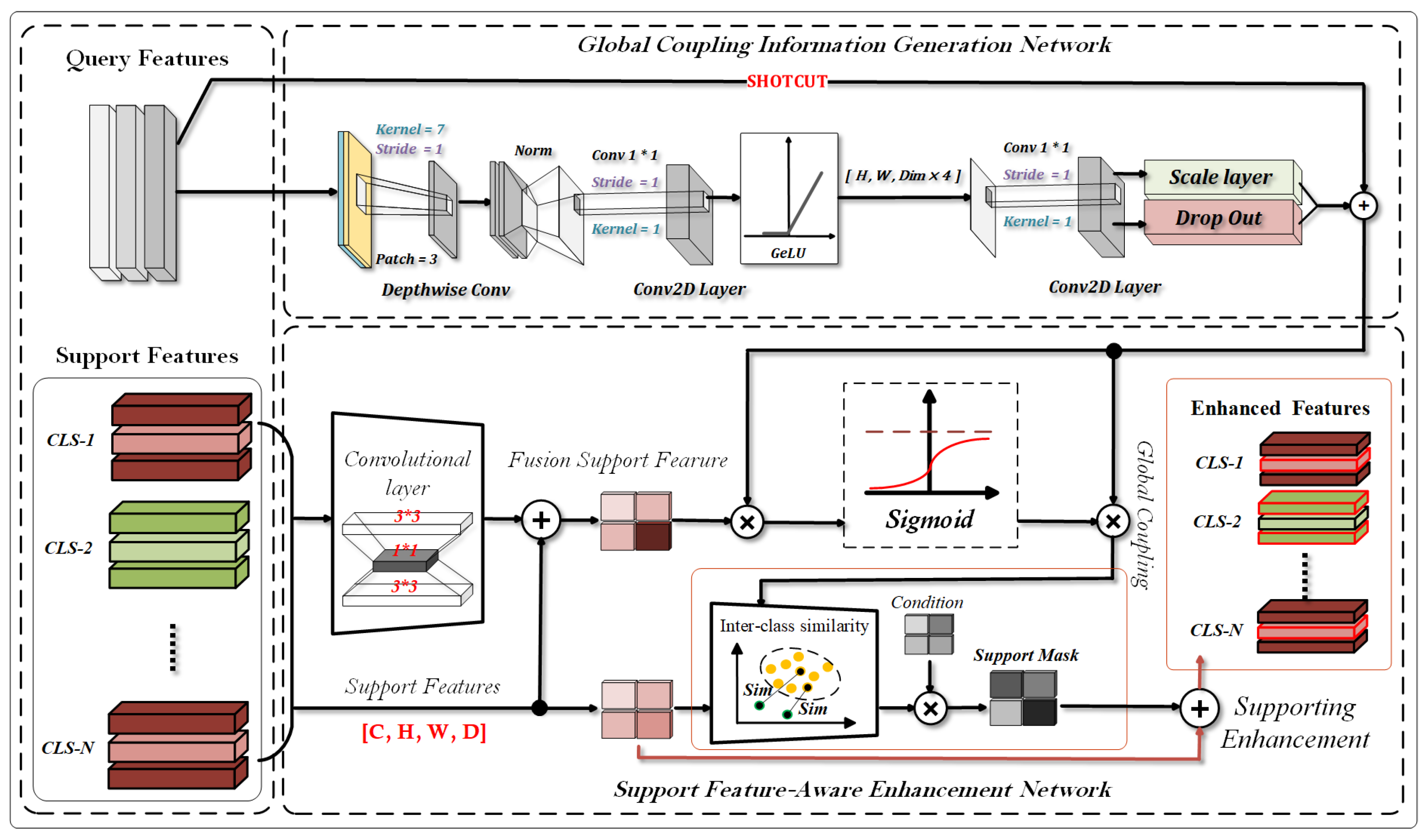 The MOMP consists of two key components: the query global coupling information generation module and the prototype-aware enhancement module. Specifically, the query features (where B denotes the batch size, C represents the number of channels, and indicates the spatial dimensions) are first fused with support features through a 2D convolutional coupling structure to generate a global attention mask , which is subsequently utilized for prototype-aware enhancement processing.