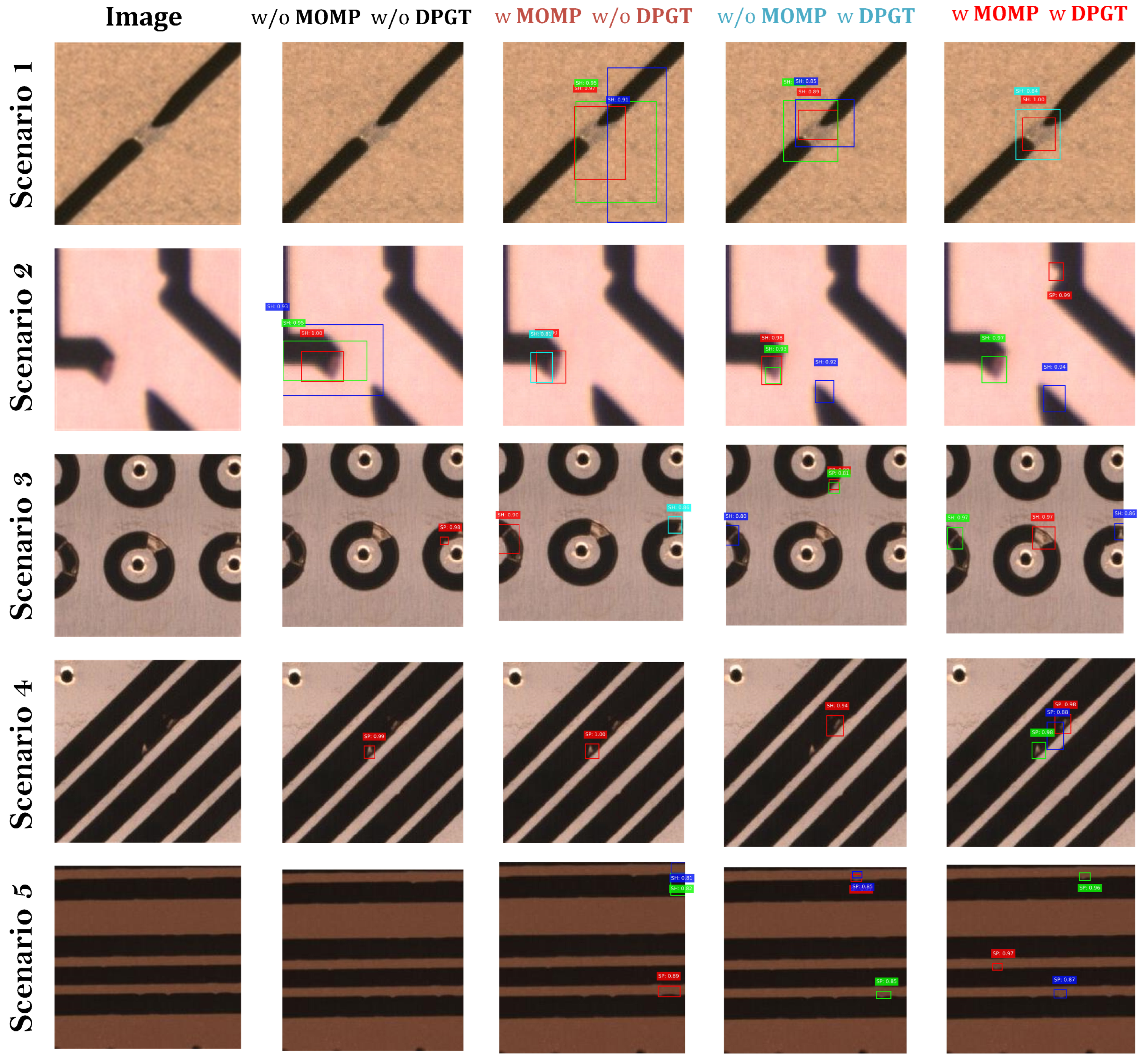 Through the predictive visualization of bounding boxes and corresponding confidence scores for defect targets, we observe the following issues with the unimproved algorithm: firstly, the model exhibits lower confidence in few-shot novel-class instances, accompanied by missed detections of novel-class objects. This indicates that the baseline algorithm suffers from overfitting to few-shot novel-class targets. However, after integrating the improved MOMP module into the baseline framework, we observe a significant reduction in missed detections for few-shot novel-class targets, along with a more balanced confidence distribution across novel class instances. Furthermore, in Scenario 2, the localization accuracy for novel class foreground targets improves substantially, with the predictions becoming more concentrated on target instances and significantly reduced background interference within bounding boxes. Our analysis reveals that the model’s missed detections primarily stem from the limited number of support samples for few-shot novel classes. This scarcity prevents the algorithm from adequately learning discriminative features for these categories, resulting in ambiguous representations in the feature space. The introduction of the MOMP module significantly mitigates this issue.