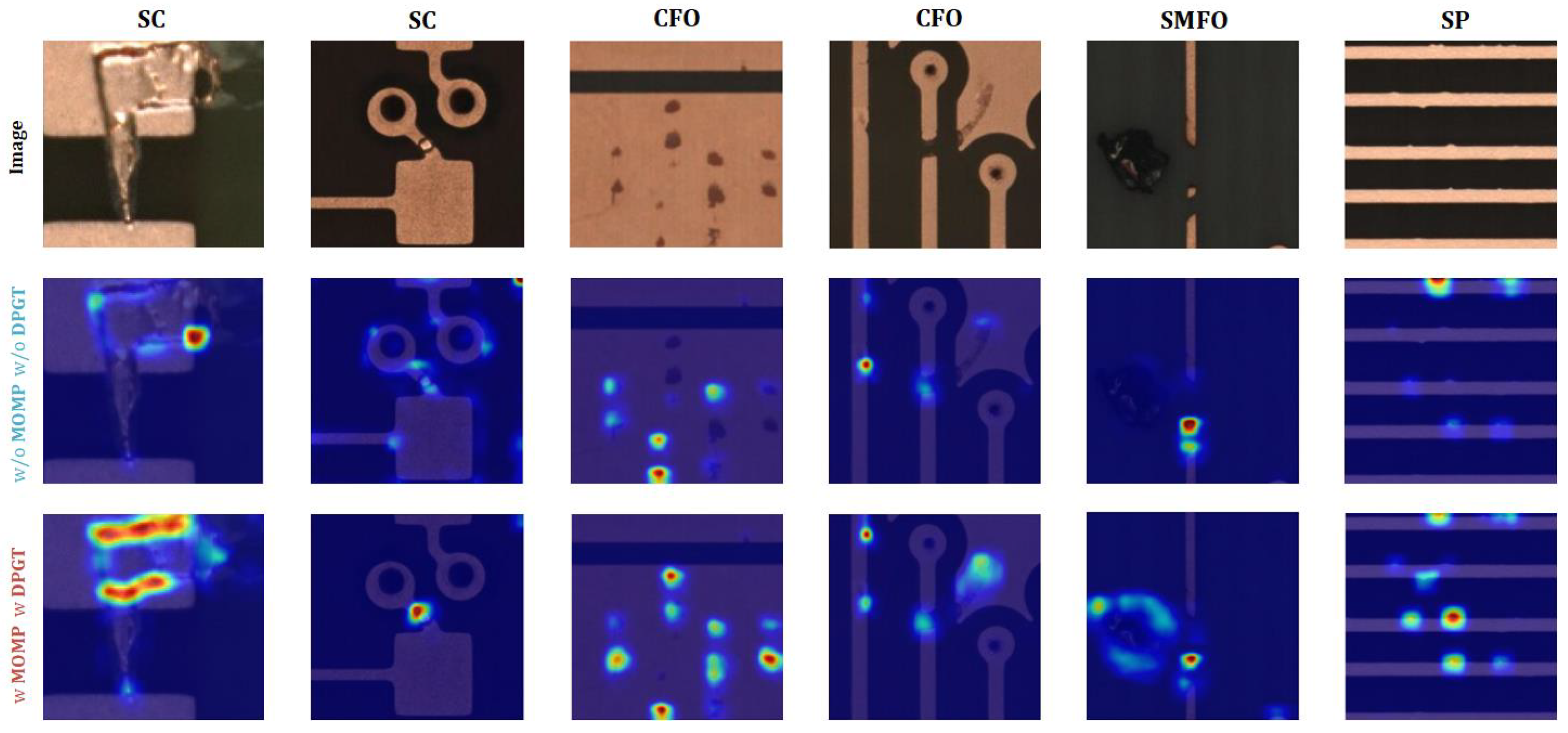Figure 9, we visualize the heatmaps on the second few-shot split of the DsPCBSD+ dataset. The first and second columns demonstrate that, for SC category targets, without the DGPT module, the model’s attention is scattered and it fails to concentrate on valid foreground regions. After incorporating the DGPT module, the model achieves effective focus on both the morphology and locations of foreground targets. The third column reveals that, when multiple small targets coexist in a single scene, without DGPT, the model cannot adequately attend to all foreground objects. With DGPT integration, the model successfully focuses on most defective foreground regions.