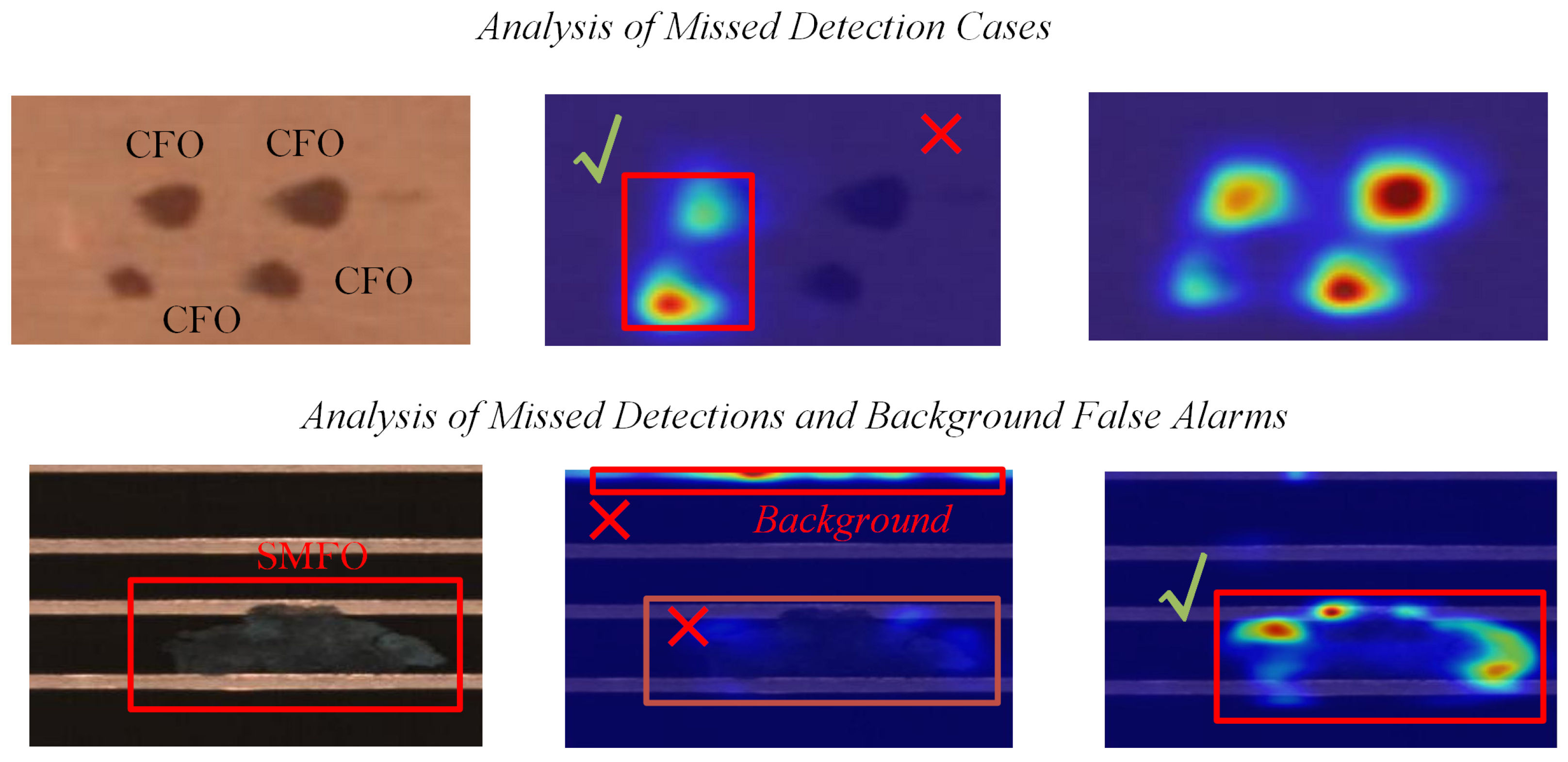 Figure 11 presents paired visualization results of heatmaps with false positive/false negative cases. Specifically targeting two typical defect types, the figure demonstrates the differences in the model’s attention distribution between successful detection and failure cases.