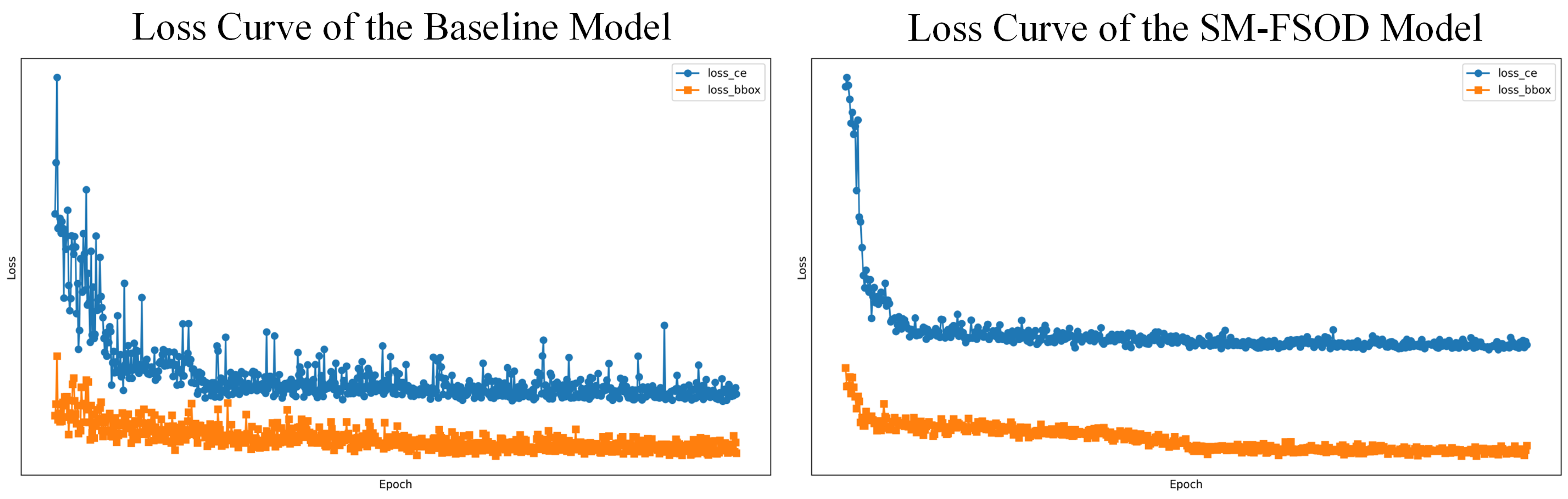 Figure 12 illustrates the training curves for both the classification and box regression losses. Compared to the baseline, our model achieves faster convergence within the first 50 epochs, suggesting that the prototype-guided matching and hierarchical optimization not only improve the final AP but also stabilize the training dynamics. This supports our claim that the proposed guidance mechanism accelerates convergence rather than merely optimizing endpoint metrics.