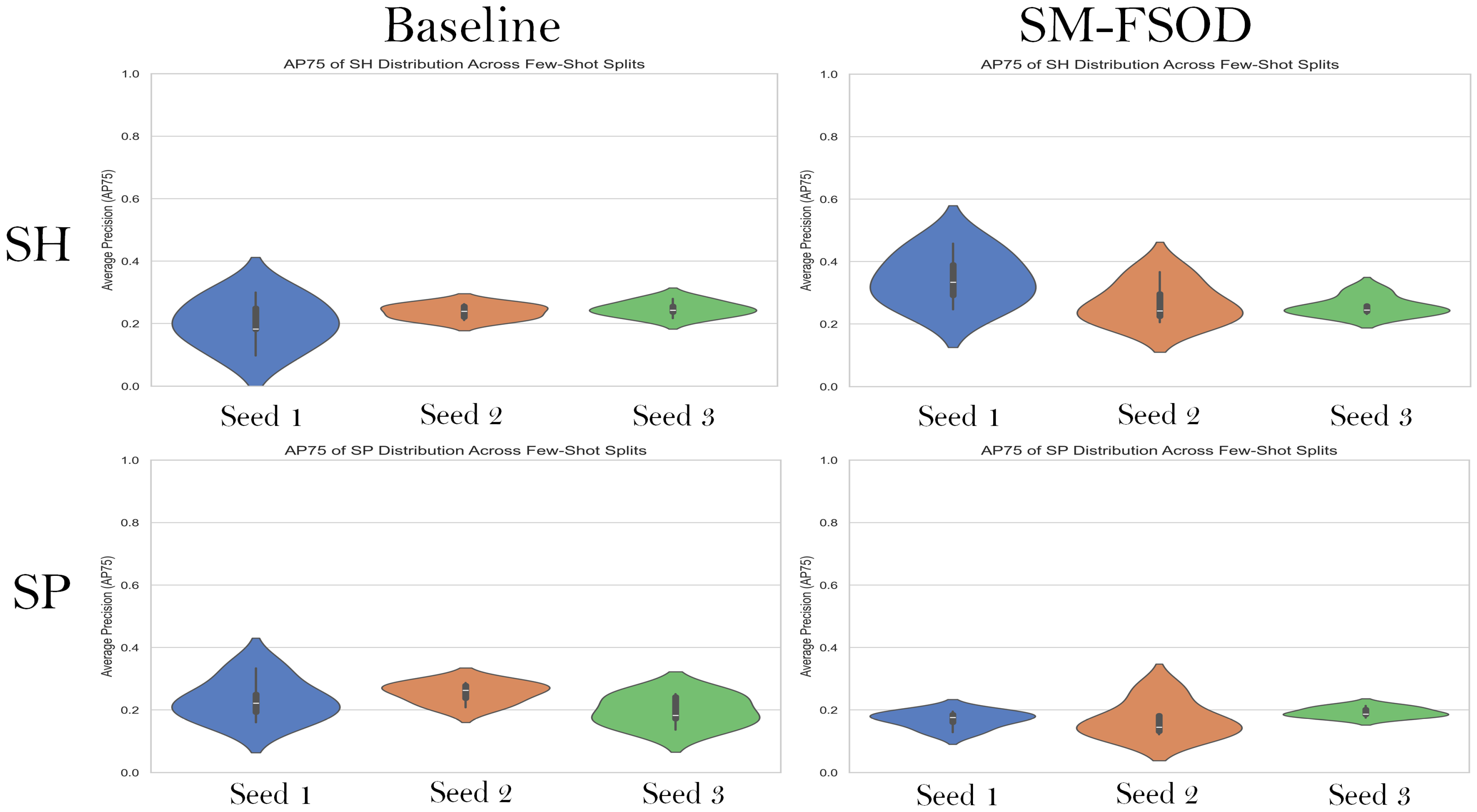 To investigate the robustness of the proposed method under different few-shot settings, we visualize the AP75 distribution of novel classes from split 2 of the DeepPCB dataset across three different configurations using violin plots. The results show that the method maintains relatively stable performance across categories. As shown in