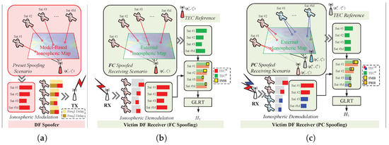 (a) Ionospheric modulation process conducted by the spoofer based on an SH model and the preset spoofing scenario. (b) Ionospheric demodulation process conducted by IIA-SDT in an FC spoofing case where IMB contributes to the GLRT decision. (c) Ionospheric demodulation process conducted by IIA-SDT in a PC spoofing case where both IMB and PRB contribute to the GLRT decision.