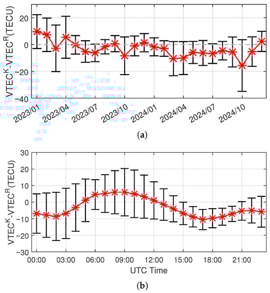IMB is time-varying. Figure 2a,b, respectively, illustrate the month-by-month and diurnal variation patterns of the mean and variance of the difference between the VTEC estimated by the BDS Klobuchar model () and the VTEC reference () provided by IGS GIM over the period from 2023 to 2024 for an example user location (40.00° N, 116.33° E). Model estimations are computed with the SH coefficients in the broadcast almanac, while the references , which are assumed to be unbiased, are obtained from the GIM products available on the IGS website. Figure 3a,b depicts the month-by-month and diurnal comparison of the root mean square error (RMSE) of VTEC, , estimated by the BDS Klobuchar model against the RMSE of the IGS GIM reference. The results reveal that there is almost always a non-negligible bias present in predictions made by the SH model. Moreover, while the SH model’s VTEC prediction capability exhibits certain monthly and diurnal variation patterns, the RMSE of the SH model prediction is generally much larger than that of the reference values.