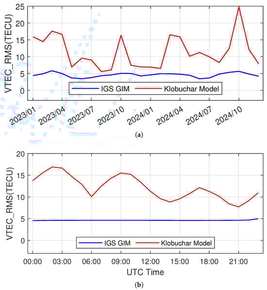 (a) Month-by-month and (b) diurnal variation patterns of the RMS error of the VTEC prediction made by the Klobuchar model and the RMS error of the GIM reference directly provided by an IGS IONEX file.