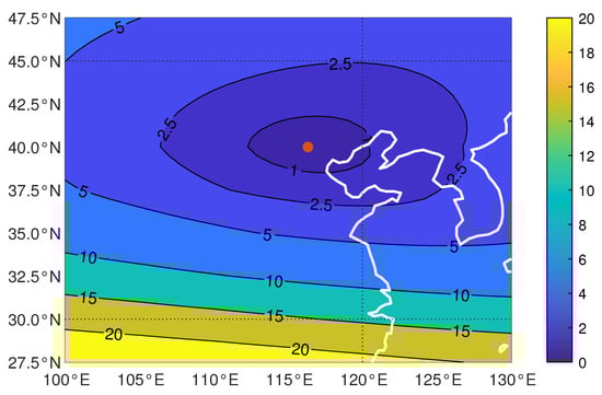 PRB originates from the spatial variation of the ionosphere. Based on ionospheric data during 2023–2024, Figure 4 reveals the relationship between the PRB RMS and two-dimensional position deviation, with the example reference location (PRB origin) marked as a red spot. Here, to simplify the following analysis and isolate the influence of elevation angle, a fixed satellite elevation angle of 90° is taken. The results indicate that PRB is more sensitive to latitude deviation than longitude due to the fact that the north–south gradient of mid-latitude TEC is much greater than the east–west gradient [32]. When the latitude deviation exceeds 7.5° (southward), the RMS value of PRB reaches twice the GIM reference RMS (∼5 TECU), implying acceptable detectability. However, user position deviation also causes deviation in the satellite elevation angle, resulting in more complex PRB variation characteristics in actual situations.
