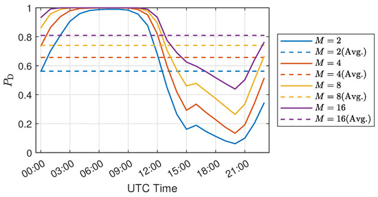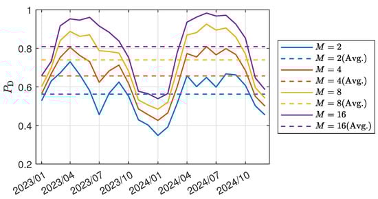 As discussed in Section 2.3.1, IMB exhibits significant temporal variation, which results in the time-varying detection performance of IIA-SDT. Figure 6 illustrates the average spoofing detection performance of IIA-SDT for each month in the year 2023–2024, with a constant false alarm rate . By comparing Figure 3a, it is observed that the more biased the Klobuchar model is in a given month, the better the detection performance of IIA-SDT. Similarly, Figure 7 displays the variation in IIA-SDT’s detection probability for each hour of the day, which approximately aligns with the diurnal variation of the model RMS error shown in Figure 2b.
