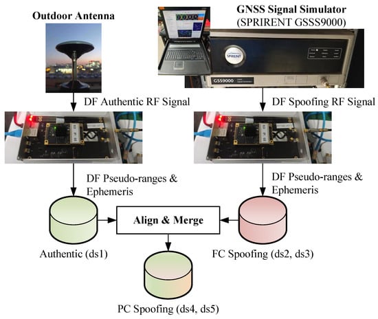 Data collection using (1) an outdoor antenna, as the non-spoofing dataset (ds1); (2) a spoofer based on a SPIRENT simulator, as the FC spoofing datasets (ds2, ds3); (3) merged observations, as the PC spoofing datasets (ds4, ds5).