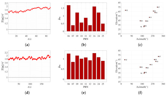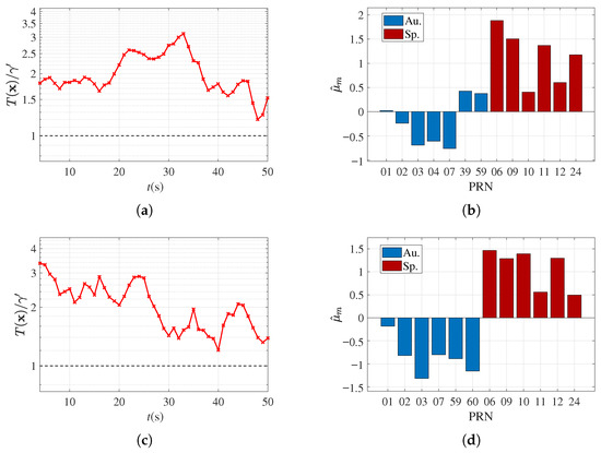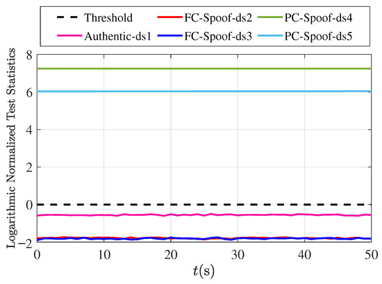The RAIM detection results are presented in Figure 14, with the false alarm rate set to . As shown, RAIM fails in the full-channel spoofing scenarios, where all detection statistics remain below the threshold, resulting in missed detections. In contrast, RAIM successfully detects spoofing in the partial-channel cases (ds3 and ds4), which is consistent with its theoretical performance bounds.
