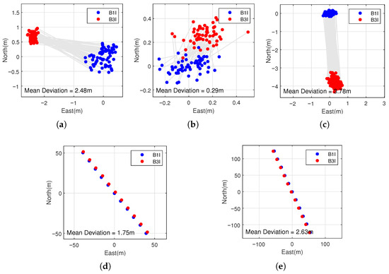 Comparison of BDS B1I positioning results and BDS B3I positioning results for DPC: (a) non-spoofing (ds1), (b) FC spoofing, BJ (ds2), (c) FC spoofing, JN (ds3), (d) PC spoofing, BJ (ds4), and (e) PC spoofing, JN (ds5).