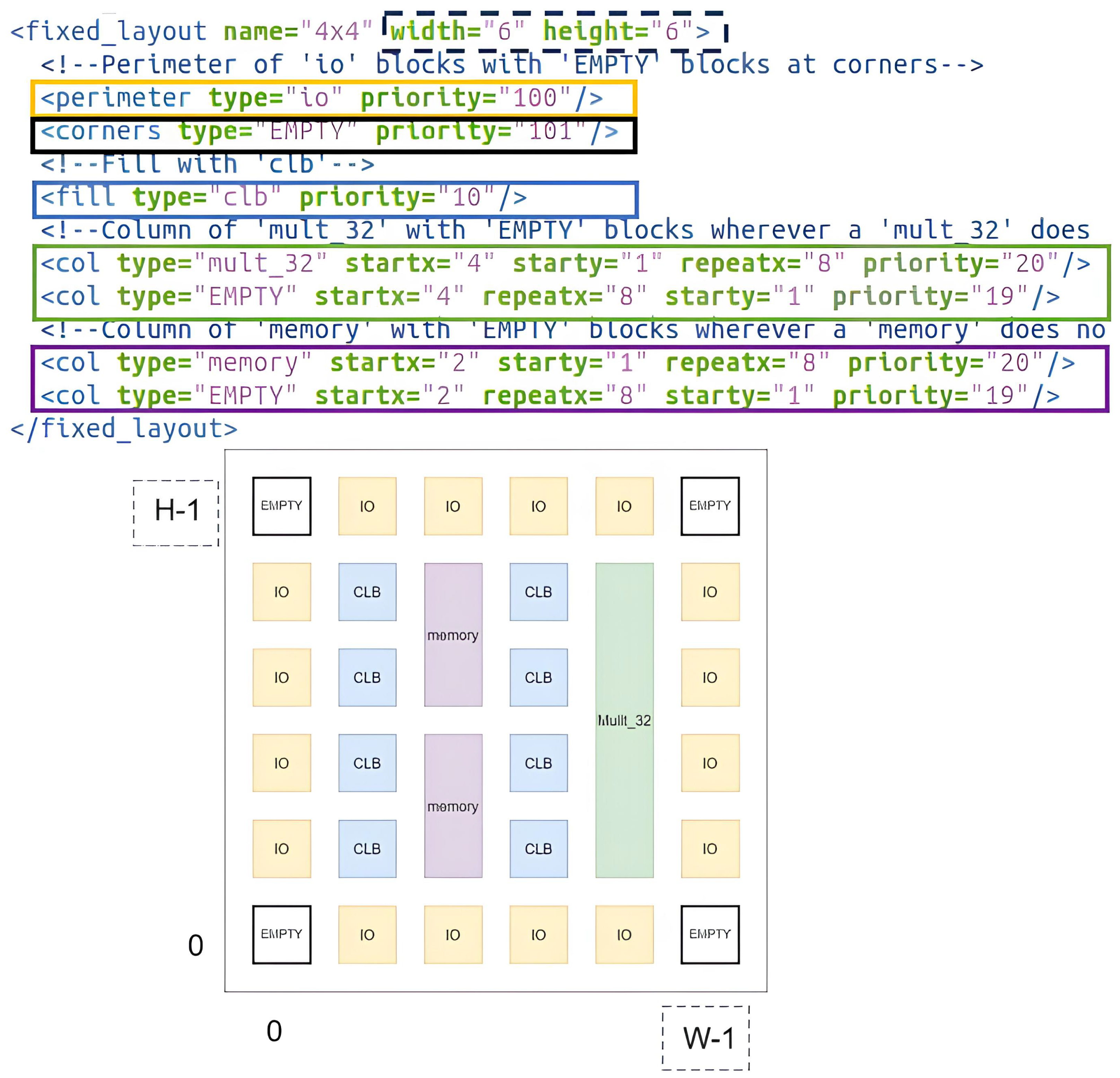 Figure 4 provides a visual representation of the semi-customized process. The figure uses color coding to distinguish different components and their code modification: gray indicates the number of blocks along the height (H) and width (W), yellow highlights the IO ports, black represents empty blocks reserved for routing, blue denotes the CLBs, green illustrates the DSP blocks, and purple identifies the memory blocks.