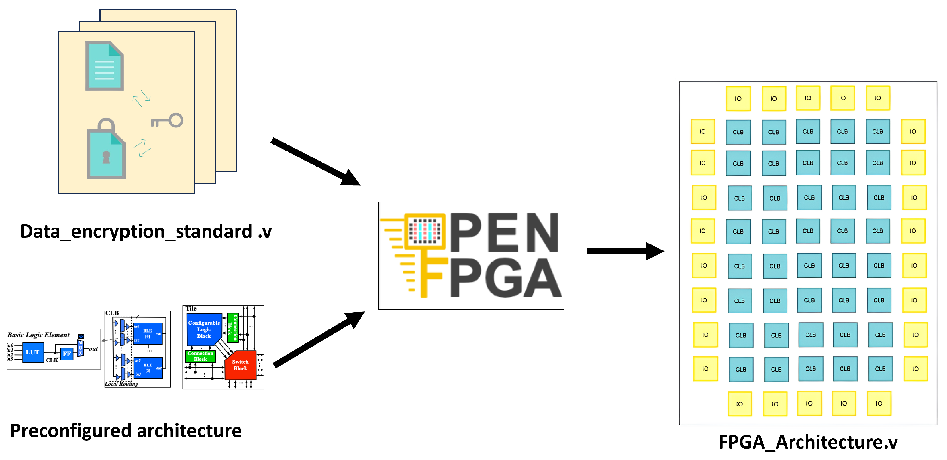 The motivation for this research arises from the growing importance of FPGAs; their flexibility makes them indispensable in a post-Moore’s Law era, where rapid design iterations and hardware adaptability are essential. Despite the availability of powerful open-source tools like OpenFPGA and OpenLane, the literature still lacks a standardized and validated methodology that connects architectural description with physical implementation, progressing seamlessly from RTL design to a fabricable GDSII layout. This absence of a comprehensive workflow hinders researchers and practitioners who aim to develop custom embedded FPGA architectures beyond functional simulation.