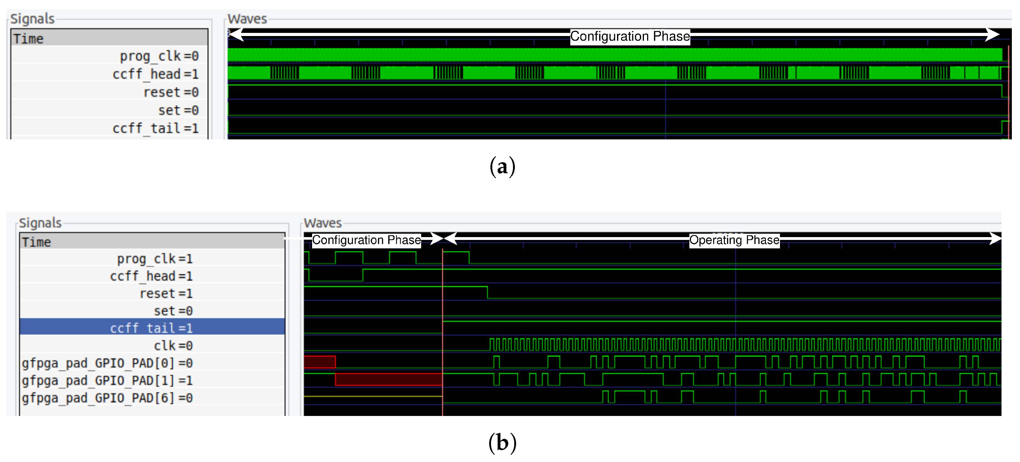 configuration phase testbench of the FPGA when it is configured as an AND gate. The figure highlights five control signals: