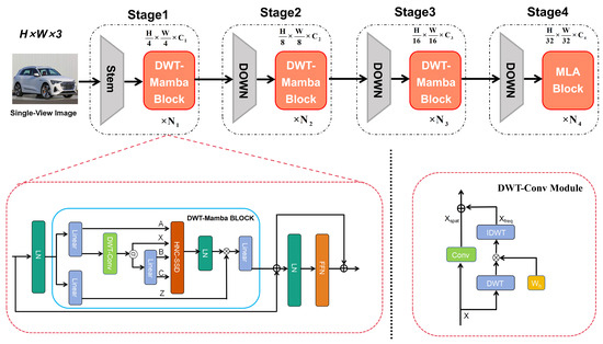 To enhance the accuracy and reliability of 3D attribute recovery under single-view image input conditions, we propose a novel inverse graphics network architecture termed DWT-Mamba, which is augmented with wavelet transforms. This architecture adopts a typical four-stage pyramid design. The input image is first processed by an initial convolutional stem to extract shallow features, followed by four progressively downsampled stages to capture deep semantic representations. Each stage comprises a stack of DWT-Mamba blocks, with the number of blocks per stage set to [2, 4, 8, 4] and output channel dimensions of [64, 128, 256, 512], respectively. For effective multiscale feature modeling, the number of attention heads in each stage is configured as [2, 4, 8, 16], in proportion to the channel width. Overlapping convolutional layers with a stride of 2 are used for downsampling between stages to maintain spatial continuity and support efficient multiscale semantic feature extraction. The structure of the network is illustrated in Figure 1.