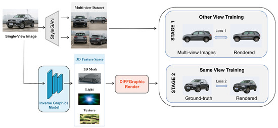 Stage 1. Training stage for 3D attribute recovery with multi-view pseudo-supervision. Earlier work shows that differentiable renderers can train neural networks for three-dimensional inference, but they usually require multi-view images, camera parameters, and object silhouettes to reach high accuracy [38,39,40], and collecting such data is costly. To overcome the scarcity of real three-dimensional data, this stage adopts a synthetic multi-view supervision scheme. The aim is to train the proposed inverse graphics model, the DWT-Mamba block, to predict the target object’s mesh, texture, and lighting. A StyleGAN generator [41] supplies latent three-dimensional structure encoded in its hidden space, allowing a single-view target image to be expanded into a large set of multi-view images of the same object. The inverse graphics model is updated with these multi-view signals; it decouples the input view from a randomly sampled target view and exploits geometric constraints between views to guide the learning of latent three-dimensional representations.