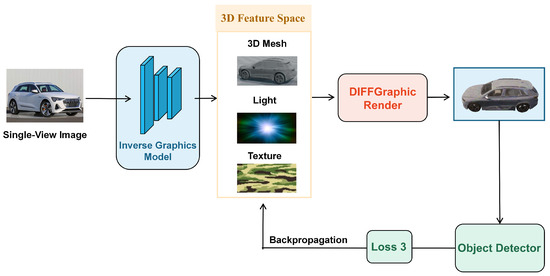 The main problem investigated in this paper is how, given only a single-view image, to generate three-dimensional adversarial texture samples that possess robustness across domains so that they can effectively induce target detection models to output incorrect predictions in both the digital and physical domains. Let the input be a single-view RGB image representing the visible facet of the target object from a specific viewpoint. First, an inverse graphics network , working together with a differentiable renderer, reconstructs the target’s three-dimensional geometry and texture attributes from the input image, thereby providing a structured optimization bridge that can be deployed in physical settings for the subsequent introduction of adversarial perturbations; this process can be expressed as