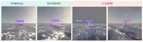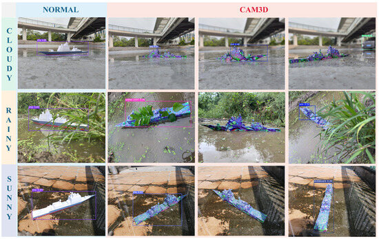 At the experimental level, CAM3D shows strong performance in both the digital domain and real physical settings. This study uses ships as the target class. In a digital simulation, the adversarial textures drive the mean AP@0.5 of mainstream detectors such as YOLOv5 and DETR down by 74.9 percent, with an attack success rate of 75.1 percent. In physical-world experiments on a printed model, we take the sunny environment—where the attack effect is the best—as an example: the detection accuracy of detectors drops by 71.1 percent, the attack success rate reaches 72.3 percent, and the average CDR is 82.2 percent, showing strong cross-domain transfer and promising real-world applicability. Ablation studies also confirm the effectiveness of the DWT-Mamba structure and its modules, providing about 4.7% gain in PSNR and 12.9% gain in LPIPS over the baseline for three-dimensional reconstruction quality. These results support the advantages of the method in geometric consistency and texture detail, and they strengthen the transfer adaptability and physical robustness of the subsequent adversarial textures.