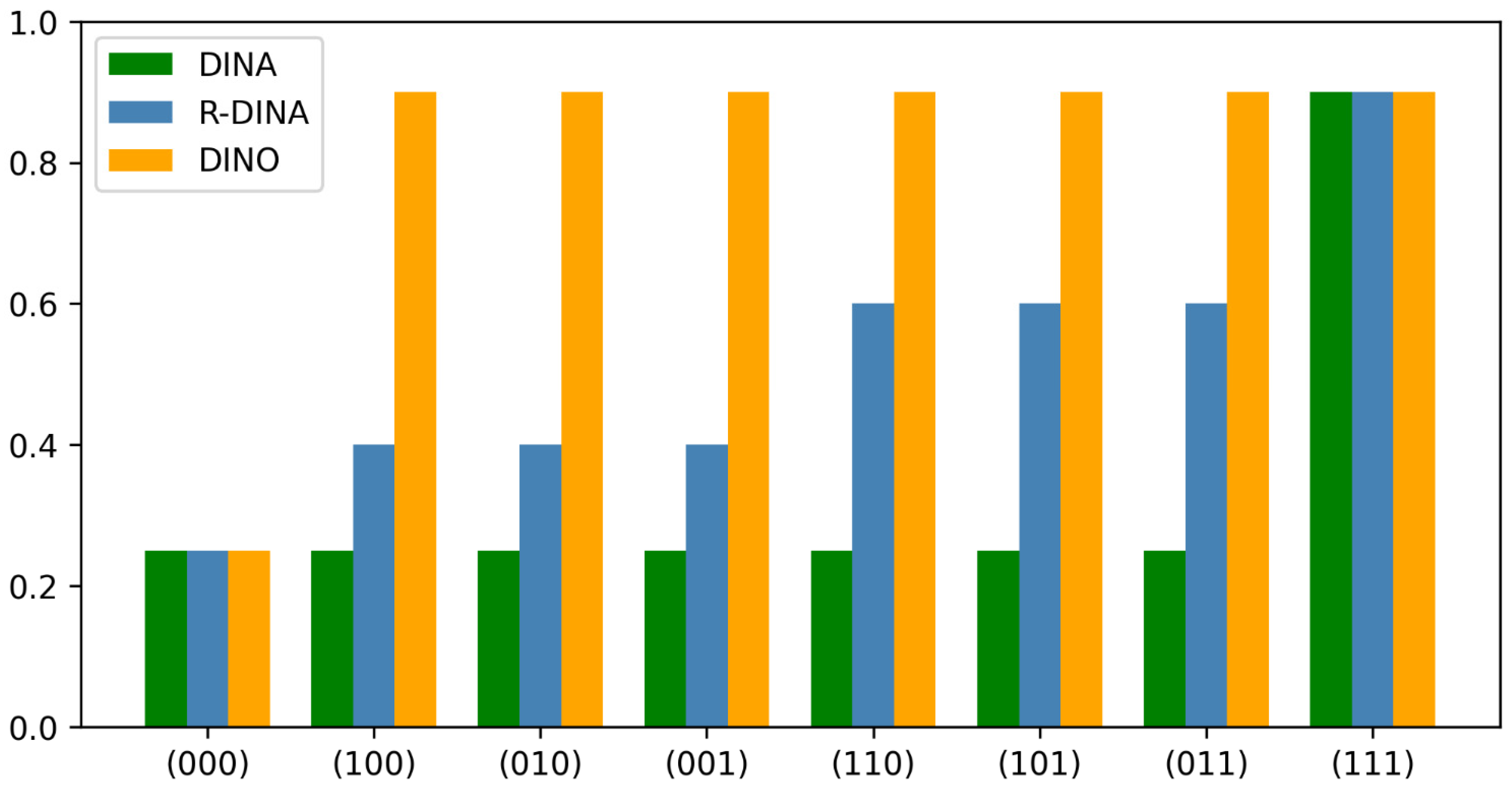26]. The rationale of DOA is that if a student exhibits higher estimated proficiency in a given attribute than another student, the former should consistently achieve better performance on exercises associated with that attribute. By averaging DOA values across all attributes, the overall plausibility of diagnostic results can be evaluated. Since other models do not provide explicit outputs of attribute mastery, DINA, NCD, ICD, and MFNCD were selected as baseline models, and experiments were conducted on three datasets, the results are shown in