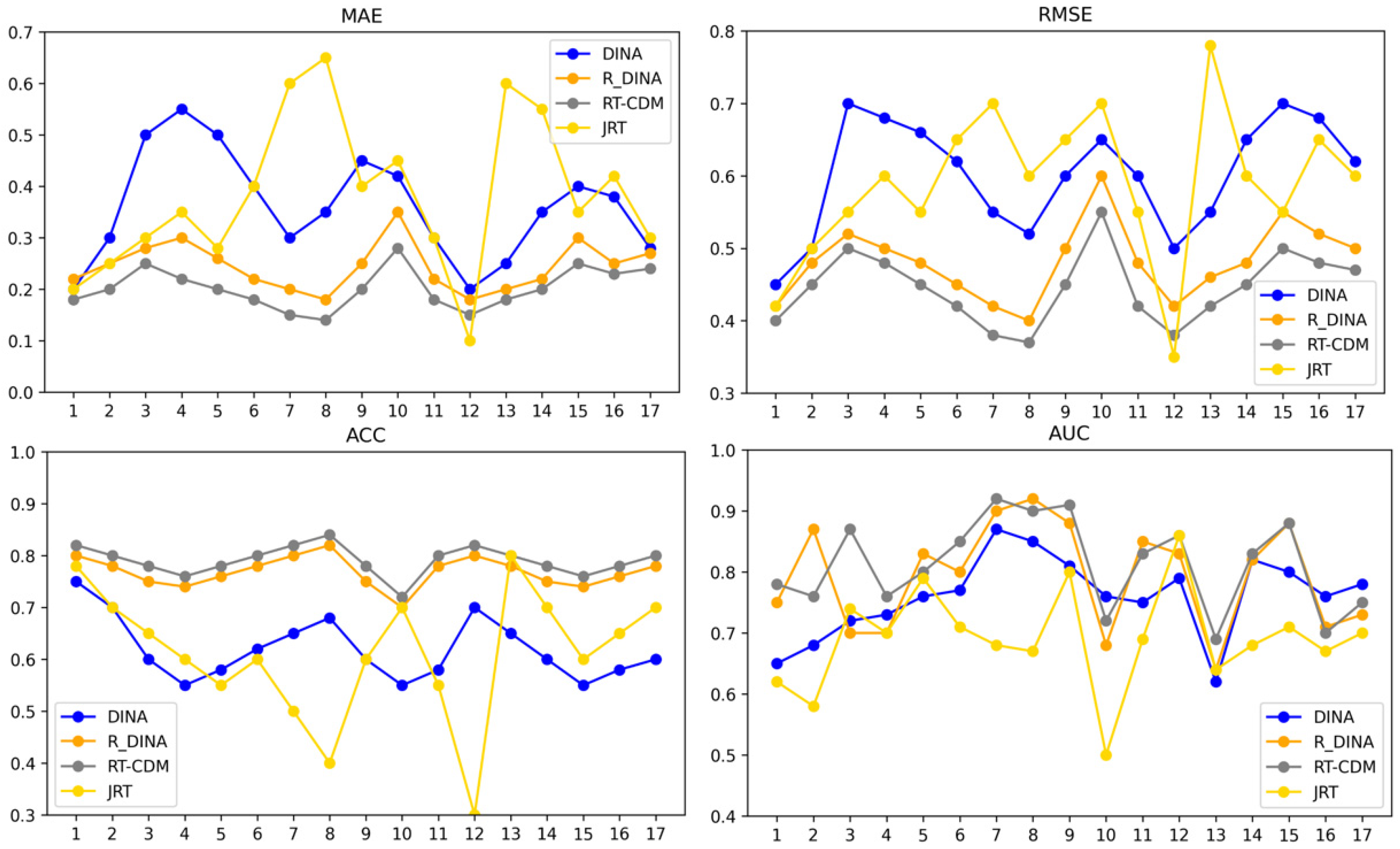 Figure 6 shows the prediction performance for each item of the four models. From each subfigure, we can observe that the RT-CDM model outperforms almost all the baselines on most items and the R-DINA model is also better than the other two models. Moreover, JRT-DINA model’s performance is the most unstable among the four models, and the results fluctuate greatly on different items, indicating that the JRT-DINA model is the most affected by the factors of the items.