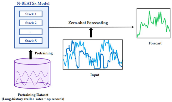 Workflow of the transfer learning-enhanced N-BEATSx framework. The model is pretrained on wells with long production histories and operational records, then applied directly in a zero-shot setting to new wells with limited data for accurate forecasting.