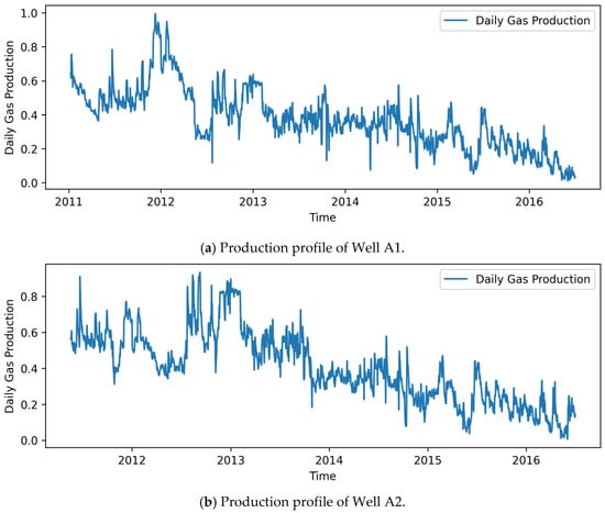 We extend our previous analysis of Wells A1 and A2 in Block S of the Sulige Gas Field, which were also examined in our earlier work using the transfer learning-enhanced N-BEATS framework. Figure 4 shows the normalized daily gas production rates for Wells A1 and A2, where production values have been linearly scaled to the range [0, 1]. Clear seasonal fluctuations can be observed, with lower production levels in summer and higher output in winter, reflecting demand-driven patterns in the Sulige Gas Field. A two-sample t-test comparing winter and summer daily production confirmed that these seasonal differences are statistically significant (p < 0.05), consistent with operational adjustments to match consumption levels.