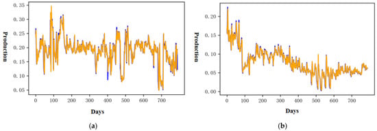 Comparison of predicted and observed normalized daily production for the two test wells. The yellow curve denotes the predicted values, while the blue curve denotes the observed values. All production values are presented in normalized form. (a) Well one; (b) Well two.