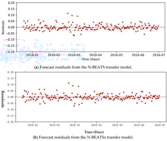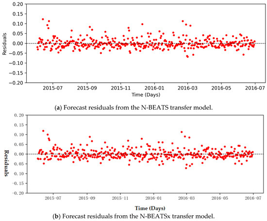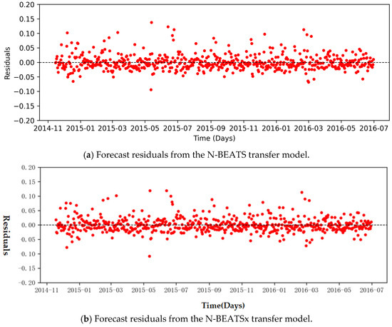 As shown in Table 6, the N-BEATSx transfer model consistently outperforms the N-BEATS transfer model across long-term, medium-term, and short-term forecasts for both Wells A1 and A2. For Well A1, the RMSE was reduced by 33.1%, 39.1%, and 23.8%, respectively, across the three forecasting horizons. The effectiveness of this approach is clearly reflected in the residual analysis. The effectiveness of this approach is clearly reflected in the residual analysis. To provide further transparency, Appendix A includes the figures: Figure A1, Figure A2 and Figure A3 show observed and forecasted values of Wells A1 for short-, medium-, and long-term horizons, while Figure A4 zooms into a representative 100-day window. These figures confirm the robustness of the N-BEATSx model at both full-dataset and sample-level scales. Figure 6, Figure 7 and Figure 8 show the residuals between the actual daily gas production rates of Well A1 and the predicted values across the three forecast horizons. The patterns observed in these figures align closely with the results reported in Table 6, confirming that the N-BEATSx transfer model achieves superior forecasting accuracy compared to the N-BEATS transfer model. In particular, the residuals from N-BEATSx are smaller and more evenly distributed, demonstrating its greater ability to capture nonlinear depletion trends, seasonal fluctuations, and operational effects. To further assess the robustness of these improvements, paired t-tests were conducted on the residuals of N-BEATSx and N-BEATS across the forecast horizons. For example, in the long-term forecast for Well A1, the paired t-test yielded p = 0.933, indicating that the observed RMSE reduction was not statistically significant at the 5% level. Similar tests for the medium- and short-term horizons also showed no significant differences, despite consistently lower RMSE values for N-BEATSx. These results highlight the importance of complementing descriptive error metrics with hypothesis testing when evaluating forecasting models.