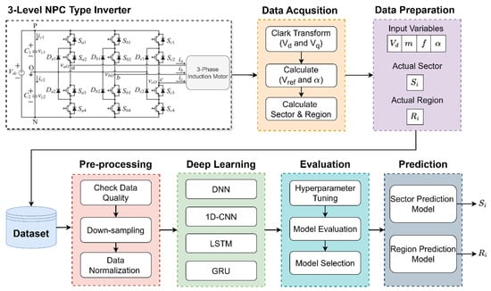 In this study, DNN, 1D-CNN, LSTM, and GRU-based DL models are evaluated for the prediction of sectors and regions for a three-level NPC inverter. The input DC voltage (Vdc), modulation index (m), switching frequency (fs), and angle are used as input variables. The data used in this study were obtained through simulation of a three-level NPC inverter model in MATLAB/Simulink, where input voltage, modulation index, switching frequency, and angle were systematically varied to generate a comprehensive dataset. The experiments were conducted considering six sectors (S1–S6) and four subregions (R1–R4). However, the reference voltage vector obtained according to the input parameters contains three regions (R2–R4) in the space vector diagram. Therefore, only three regions were used in the training and testing of the prediction models. This allowed the classification of six sectors and three regions for the inverter. In this study, the input variables are processed differently depending on the network architecture. For the DNN model, the variables are provided as static feature vectors, allowing the model to learn relationships directly from individual data points. In contrast, CNN, LSTM, and GRU architectures are trained on sequentially structured inputs, where the same features are arranged as time-series windows. This enables CNN to capture local spatial patterns, while LSTM and GRU are capable of modeling long-term temporal dependencies. Such a distinction ensures that each architecture is utilized in line with its strengths in feature extraction and sequence modeling.