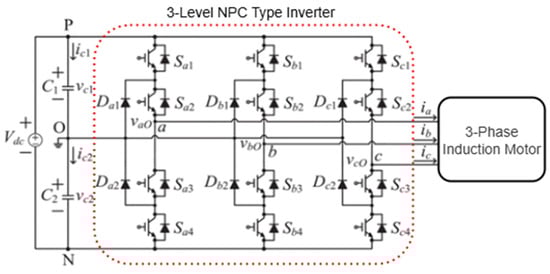 Three-level Neutral Point Clamped (NPC) type inverters are preferred due to their high efficiency and low harmonic values [20]. Three different voltage levels, , 0 ve are generated at the output of the inverter [21]. Space vector pulse width modulation (SVPWM) is a switching technique used to achieve the desired waveform and high efficiency. Figure 2 shows a 3-phase 3-level diode-coupled inverter feeding an induction motor [22]. The SVPWM technique is used to control the output voltage and frequency of the inverter.