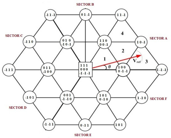The space vector diagram of a three-level inverter of type NPC is shown in Figure 3. The space vector has a hexagonal structure with six sectors and four regions within each sector.