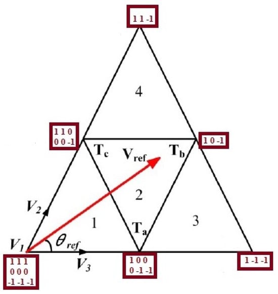 As can be seen in Figure 4, the reference voltage vector is represented by three voltage vectors in the lower area. for the switching states [1 0 0/0 −1 −1], for the switching state [1 0 −1] and for the switching state [1 1 0 0/0 0 0 −1]. Accordingly,