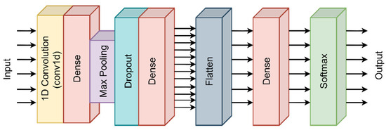 Convolutional neural networks (CNNs) are popular and powerful models, especially in image processing and time series analysis [29,30]. The 1D-CNN models that work with one-dimensional data are widely used, especially in areas such as signal processing, speech recognition, EEG analysis, and classification of time series data [31,32]. This model creates feature maps by applying displacement filters to the input data. The convolution process is mathematically defined as follows: