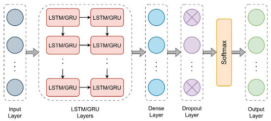 The LSTM model is used to capture long-term dependencies in time series data. It is optimized to make the best prediction while preserving the temporal patterns of the input data. The GRU model works similarly to the LSTM but has an optimized structure that requires less computational effort. This model is preferred for learning time series patterns with fewer parameters. Figure 6 shows the proposed LSTM/GRU-based model architecture for predicting sectors and regions.
