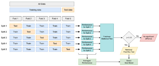 The CV technique and statistical testing procedure used in the performance measurement of the DL models for predicting sectors and regions are shown in Figure 7. The 5-fold CV technique was used to measure the performance of the models, and the model results were evaluated using the Friedman test followed by the Nemenyi post-hoc test. If the Friedman test showed a significant difference (p < 0.05), the Nemenyi post-hoc test was used to select the best model with a significant difference.