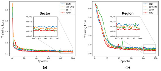 Training loss curves of deep learning models (a) for the sector, (b) for the region.