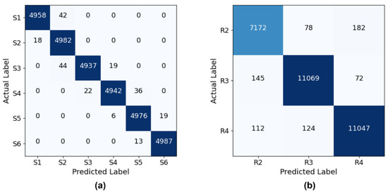 The confusion matrix of the GRU-based models with the highest performance for predicting sectors and regions is shown in Figure 9. As can be seen in Figure 9a, the classification performance of the model is quite high for the six sectoral classes (S1–S6). It can be seen that the model is able to correctly distinguish the sectoral samples, and there is minimal confusion between the classes. The most successful classes are S1, S2, and S6 with precision and recognition values of over 99%. For class S4, the confusion with S5 is particularly noteworthy. The fact that some instances of S4 were incorrectly predicted as S5 suggests that these two classes may have semantically similar properties. Figure 9b shows the confusion matrix for the three regional classes (R2–R4). While the accuracy in this classification task is high, more confusion between the classes can be observed. In particular, it is noticeable that classes R2 and R4 are confused with each other. In both tasks, the GRU model successfully learned the sequential structure of the time series data and discriminated between the classes with high performance. While the F1 score for the sectoral classification was 99, it was 97% for the regional classification. This difference provides important evidence of the similarities between the classes and the overall generalizability of the model.